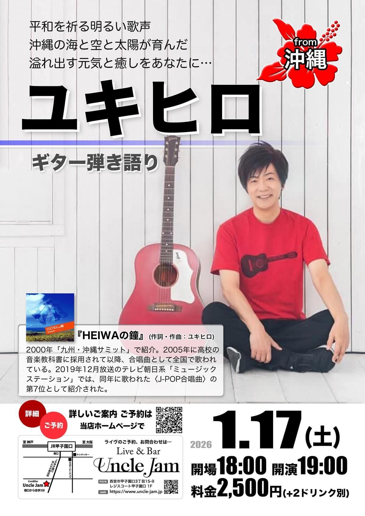 『HEIWAの鐘』という合唱曲をご存知でしょうか?平和を祈る、それでいて明るく力強い歌。今、全国の高校で歌われているその歌を世に送り出したシンガーソング・ライター、それがユキヒロさん。沖縄の海と空と太陽が育んだおおらかな感性、溢れ出す元気と癒し。そんな前向きなエネルギーに満ちたユキヒロさんの伸び伸びとした歌声と、底抜けに明るいトークを存分にお楽しみ下さい。