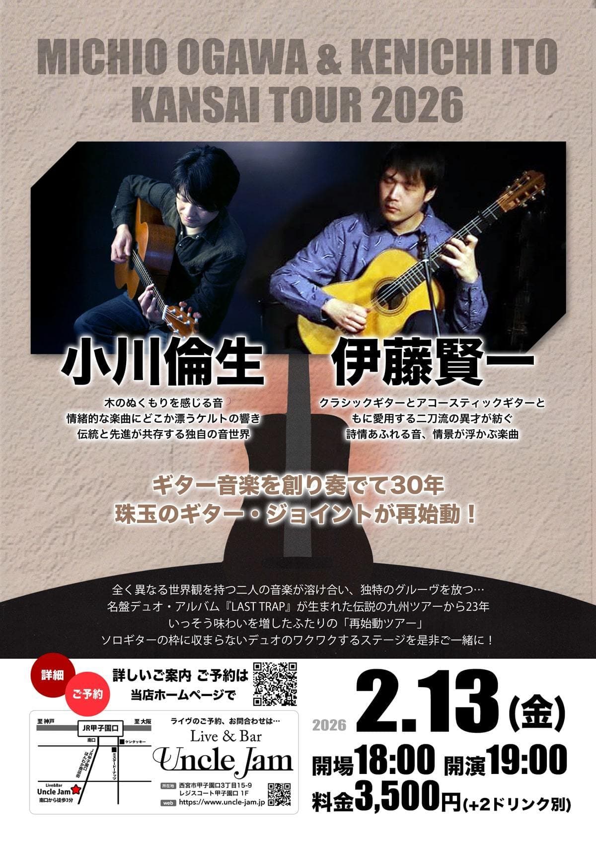 同年代のギタリスト、小川倫生と伊藤賢一。二人が久々にタッグを組んで繰り広げる音楽旅。それぞれに全く異なる世界観を持つ二人の音楽が溶け合い、独特のグルーヴを放つ…そんな最高のジョイント・ライヴをお届けします。名盤デュオ・アルバム『LAST TRAP』が生まれた伝説の九州ツアーから23年、いっそう味わいを増したふたりの「再始動ツアー」から、今度は何が飛び出すことになるのか…ソロギターの枠に収まらないデュオのワクワクするステージを是非、ご一緒に!