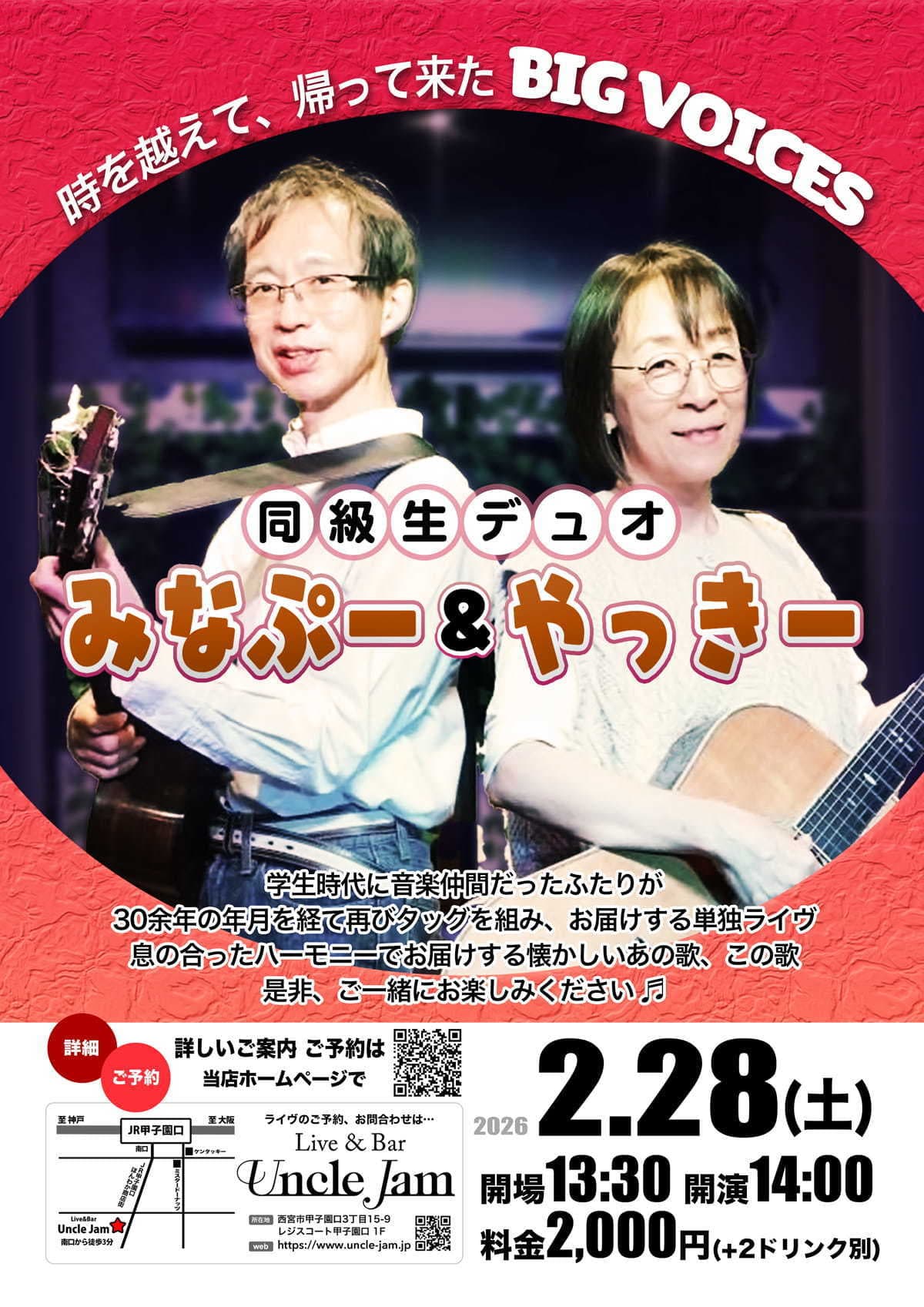 学生時代、音楽サークルの同じバンドで歌っていた2人が、30年余りの歳月を経て再びタッグを組んでから2年半。大好評だった昨年に引き続き、再び単独ライヴに挑みます。歌謡曲、ポップスからアニメソングにCMソングまで、息の合ったハーモニーでお届けする懐かしいあの歌、この歌。今回もたっぷりお楽しみください🎵