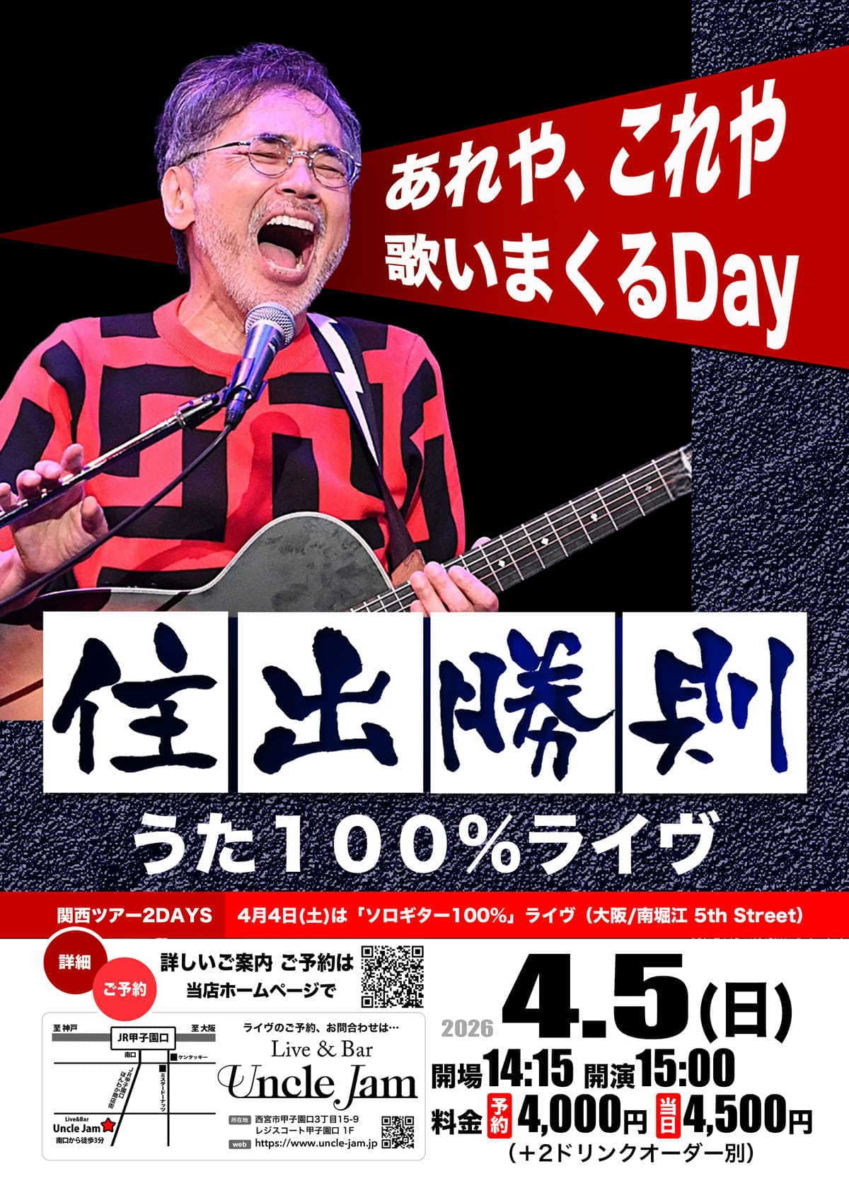 フォークグループ「シグナル」のメンバーとして、あの大ヒット曲『20歳のめぐり逢い』でデビューされたのが1975年。そして今、グルーヴ感あふれるソロギタリストとして、そして円熟の歌声でファンを魅了する弾き語りシンガーとして、二刀流スタイルがすっかり定着した住出さん。今回の関西ツアーでは、前日開催の「ソロギター100%」(於:大阪・南堀江/「5th Street」さん)と対を成す形で、アンクルジャムでは「うた100%」に振り切ってお届けします。 ご自身のヒット曲のみならず、和洋通じた名曲の数々を、最高のギター弾き語りでお届けします。こちらもどうぞお楽しみに♫