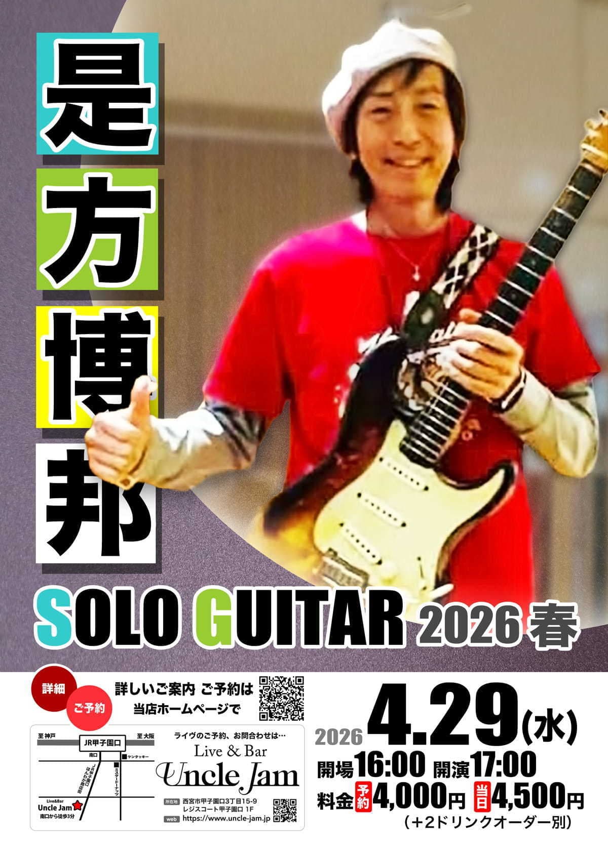 1970年代半ば、大村憲司さんの誘いから始まったキャリアは、井上陽水、小椋佳、桑名正博といったトップミュージシャンのレコーディングやツアーを皮切りに、1980年代以降は、高中正義グループ、松岡直也グループなどフュージョン・シーンを中心に活躍。現在はフュージョンバンド「野獣王国」をはじめ、様々なプロジェクトをリードされている是方博邦さん。その素晴らしいギターと気さくな人柄に触れて頂けるライヴ。是非、ご一緒にお楽しみください。