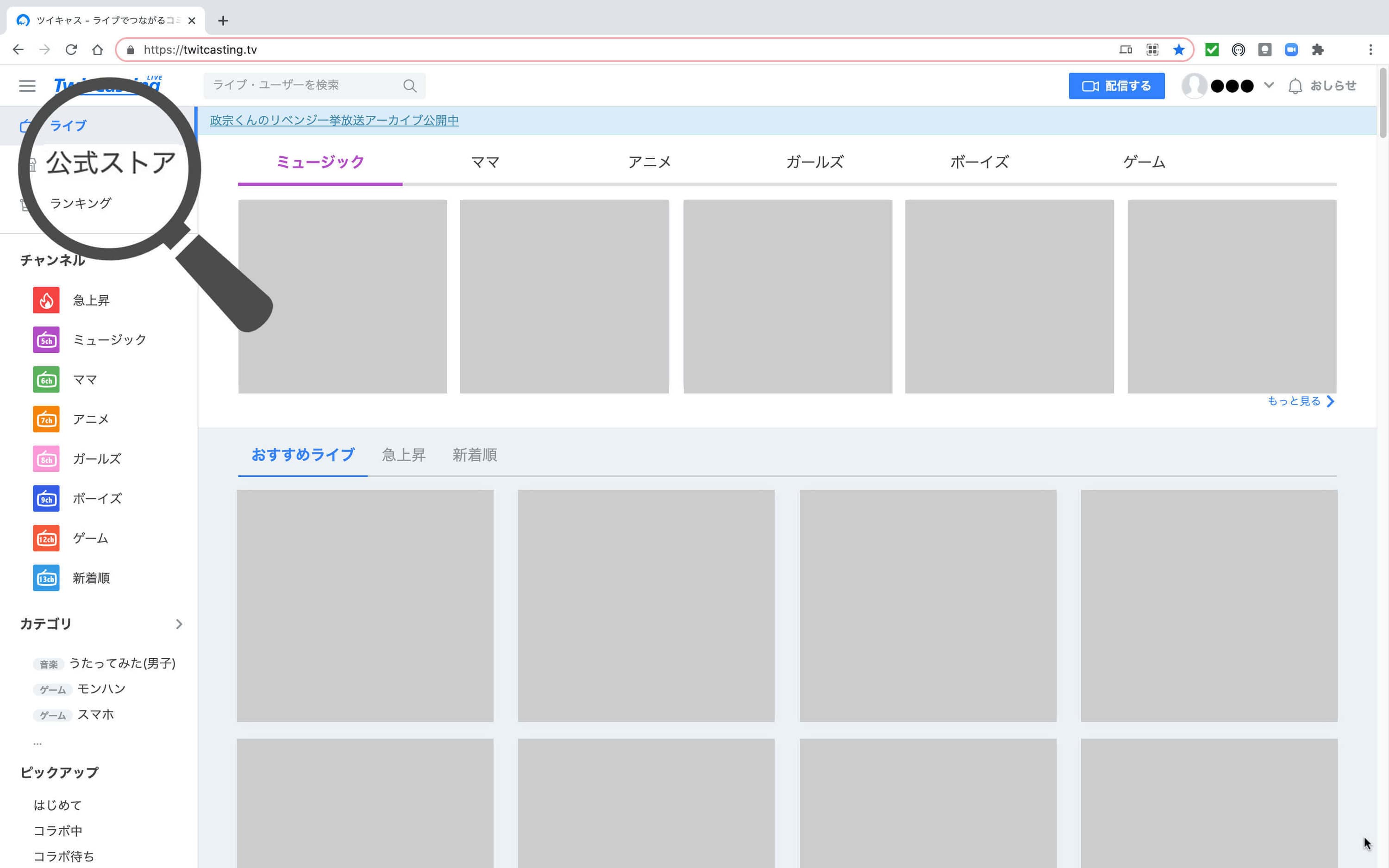 録画を再視聴いただくには… 録画を再視聴いただくには… 1.まずはログイン 必ずチケットを購入されたIDでログインして下さい 2.公式ストアをクリック 3.マイチケットをクリック 4.見たい録画を選ぶ 「公開中の録画」というボタンをポチっと 5.開いたページを下へスクロール ご視聴のボタンは画面の下の方にあります 6.録画視聴のバナーをクリック 左上に「録画」と表示された画像をクリック ※「ライヴ視聴ページへ」という青いバーは、生配信をご覧頂く時に使用します。再視聴の際はクリックしないで下さい。